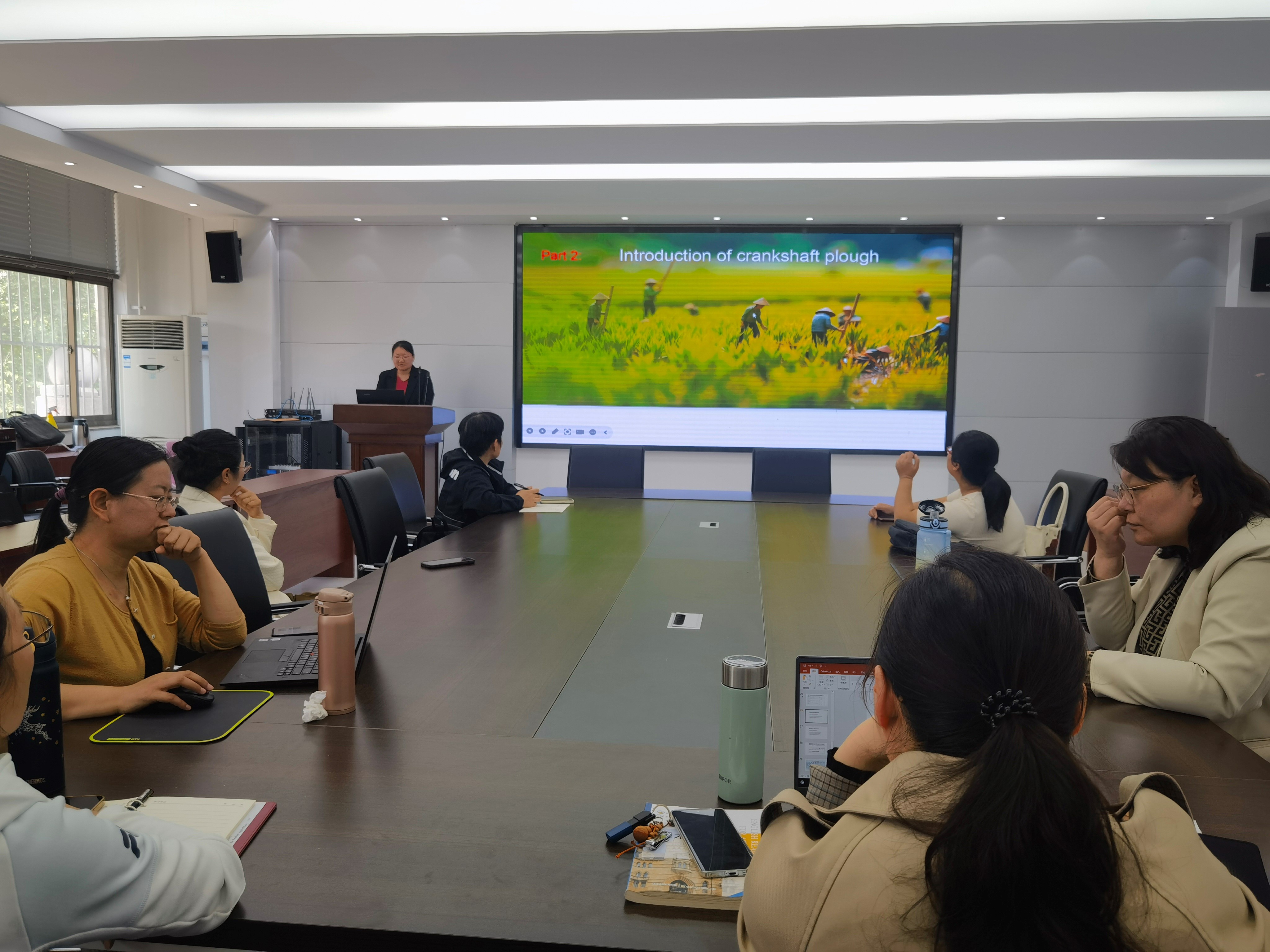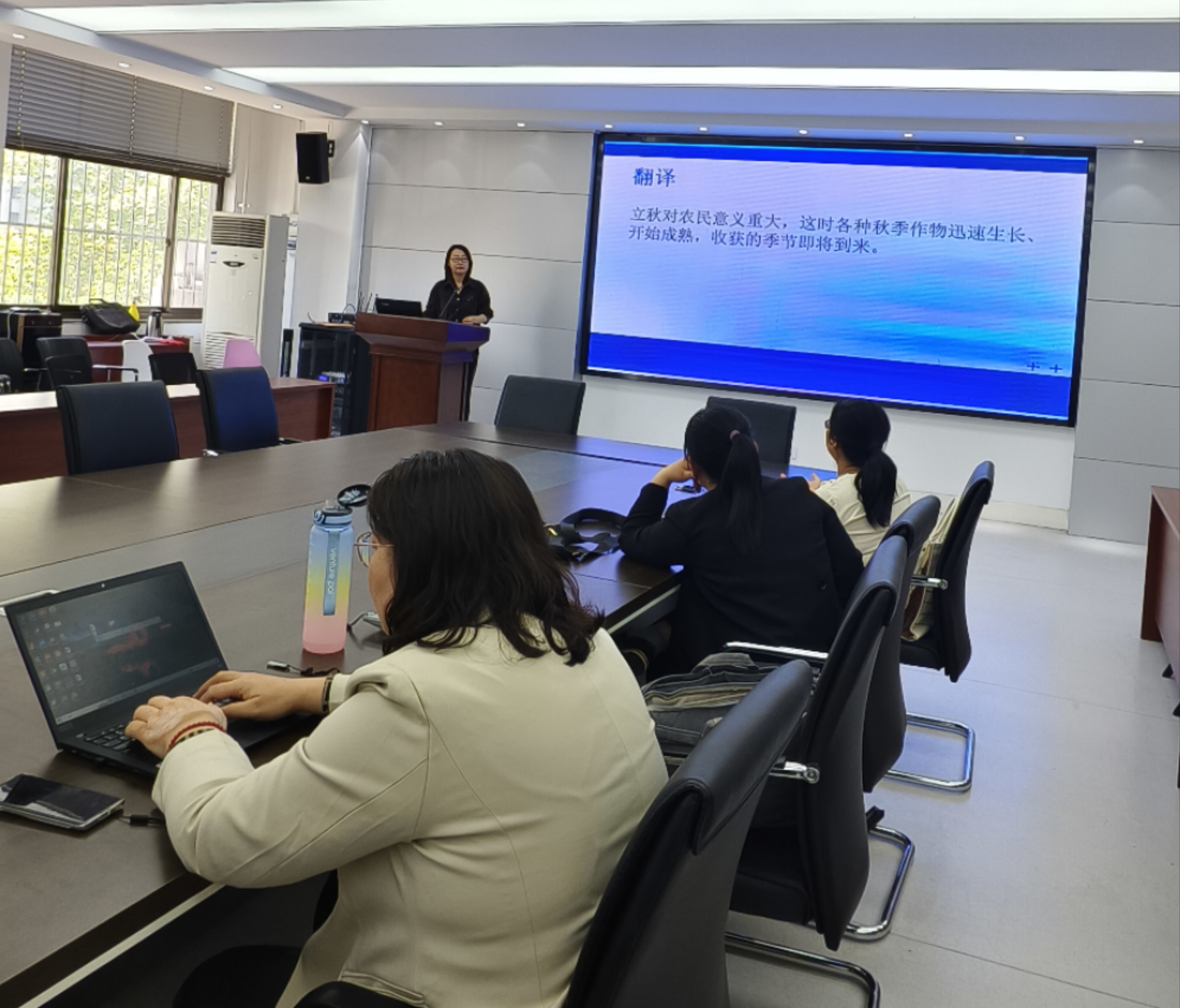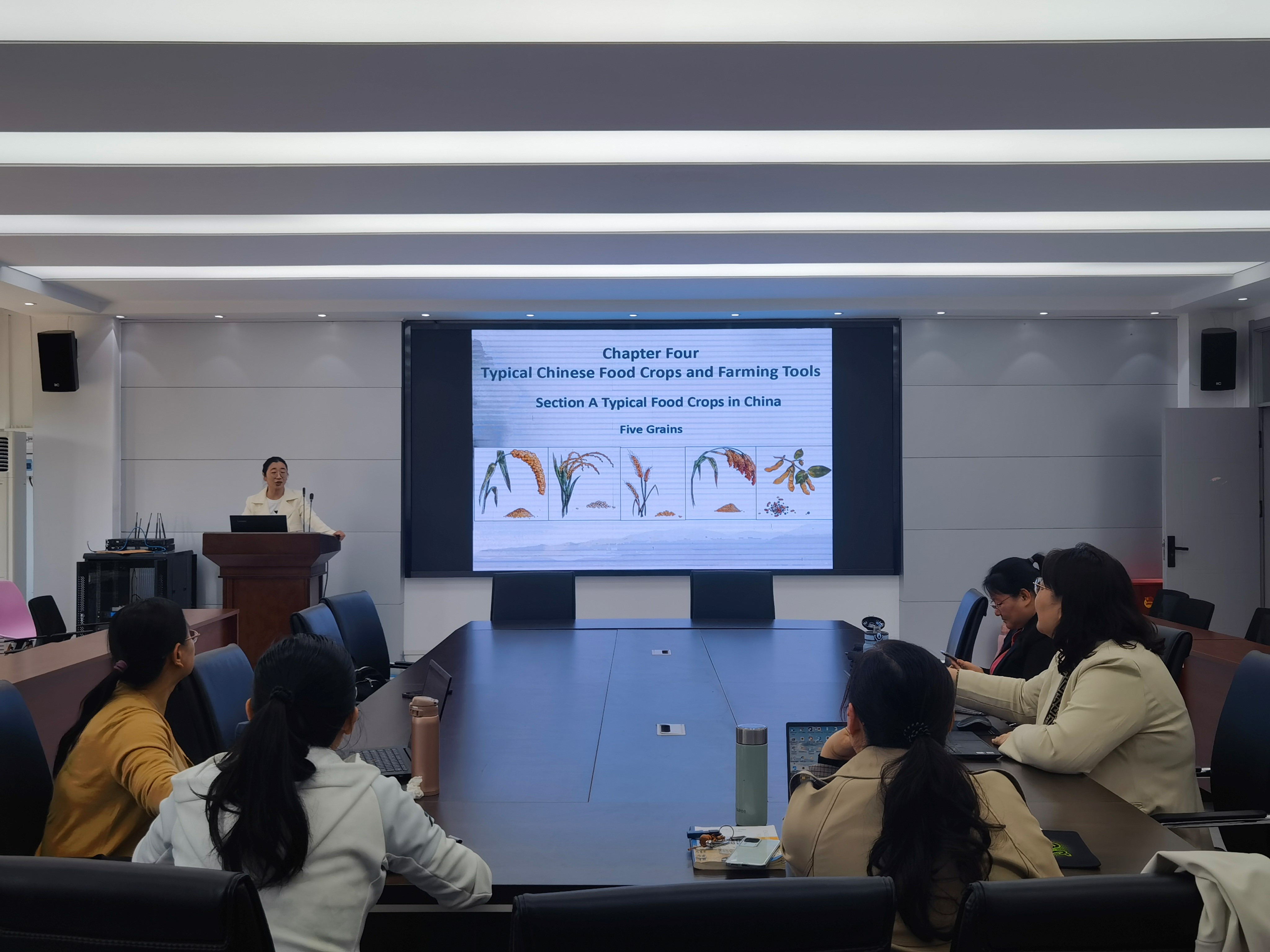 种法娟老师对《农耕文化翻译》第四单元的教学设计进行说课。老师们一起研讨了翻译技能的呈现方式、段落翻译的互动手段和小组翻译汇报组织形式。