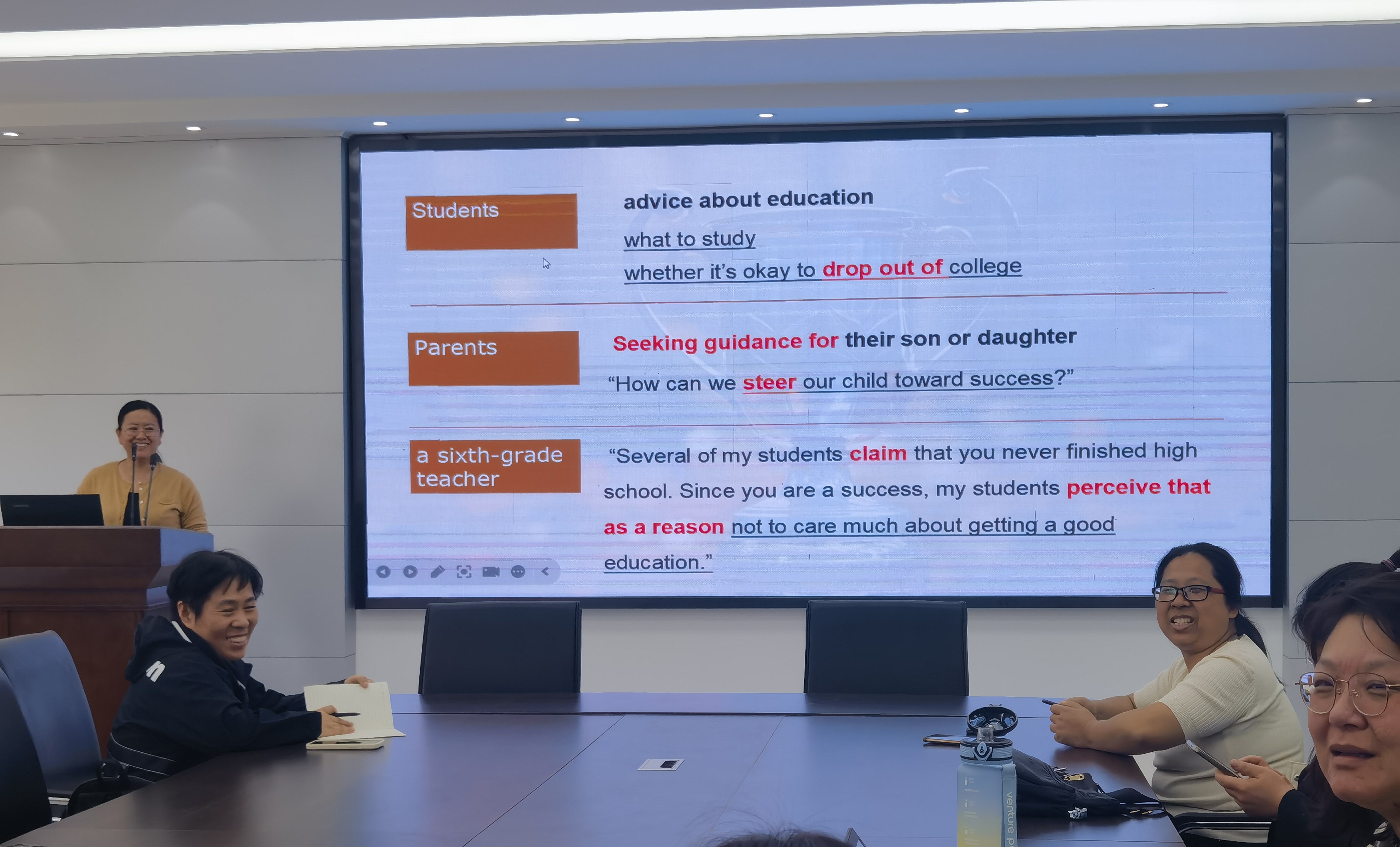 张淑霞老师对《体验英语IV》第五单元—成功之路的教学设计进行了说课。老师们就教学步骤、扩展教学资源和线上线下衔接等问题进行了研讨。