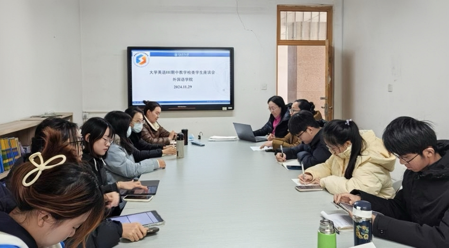 座谈会的主要目的是了解学生对大学英语教学的接受度和满意度,收集反馈学生对大学英语教学的建议和意见,以便更好地指导教学。来自各个学院的12名学生代表围绕大学英语学习及教师课堂授课进行了交流,与会教师认真聆听了学生提出的问题和建议,并做了详细记录,围绕学生提出的问题进行了现场解答。