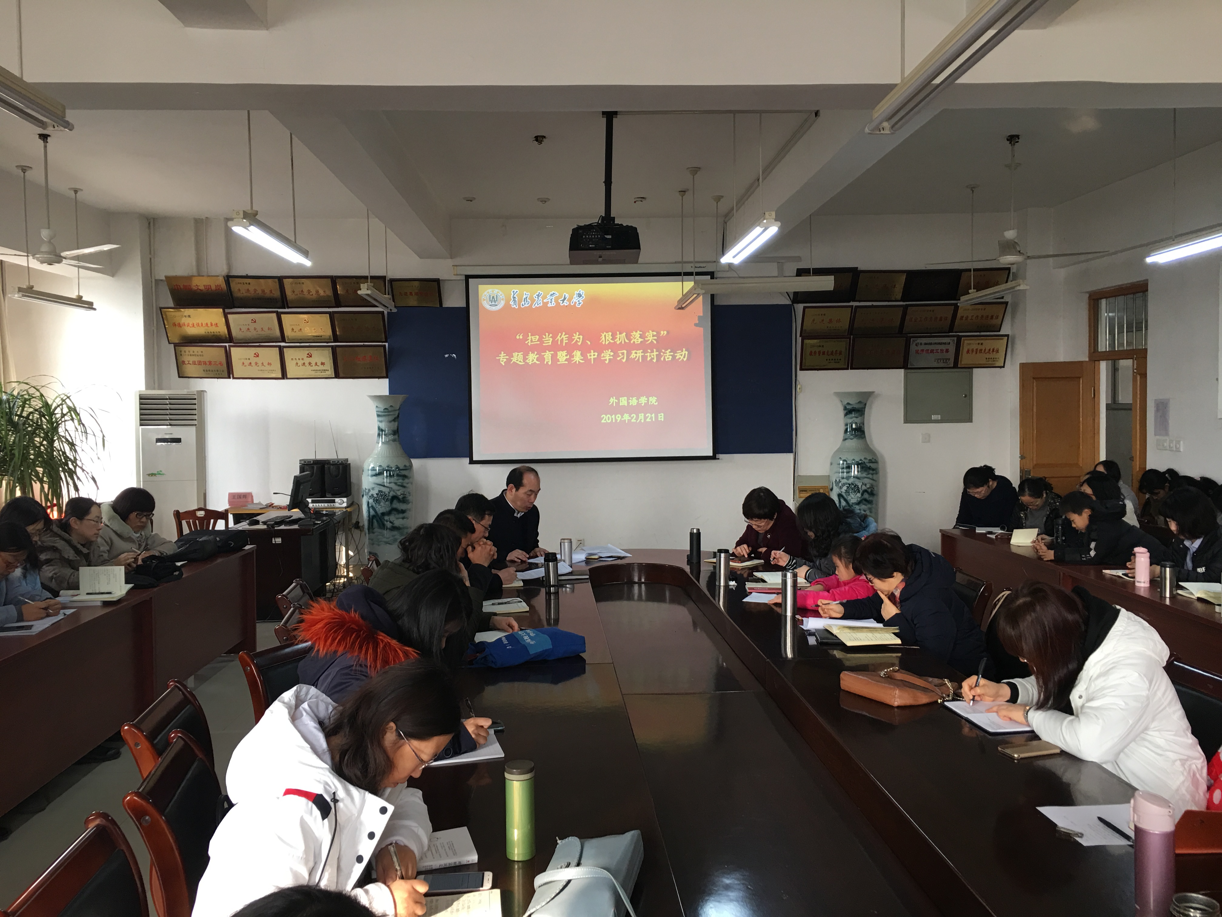 2月21日,William威廉英国在文经楼C220开展“担当作为、狠抓落实”专题教育暨集中学习研讨活动。学院党政领导出席会议,全体教职工参加学习交流,会议由党委书记王仁高主持。