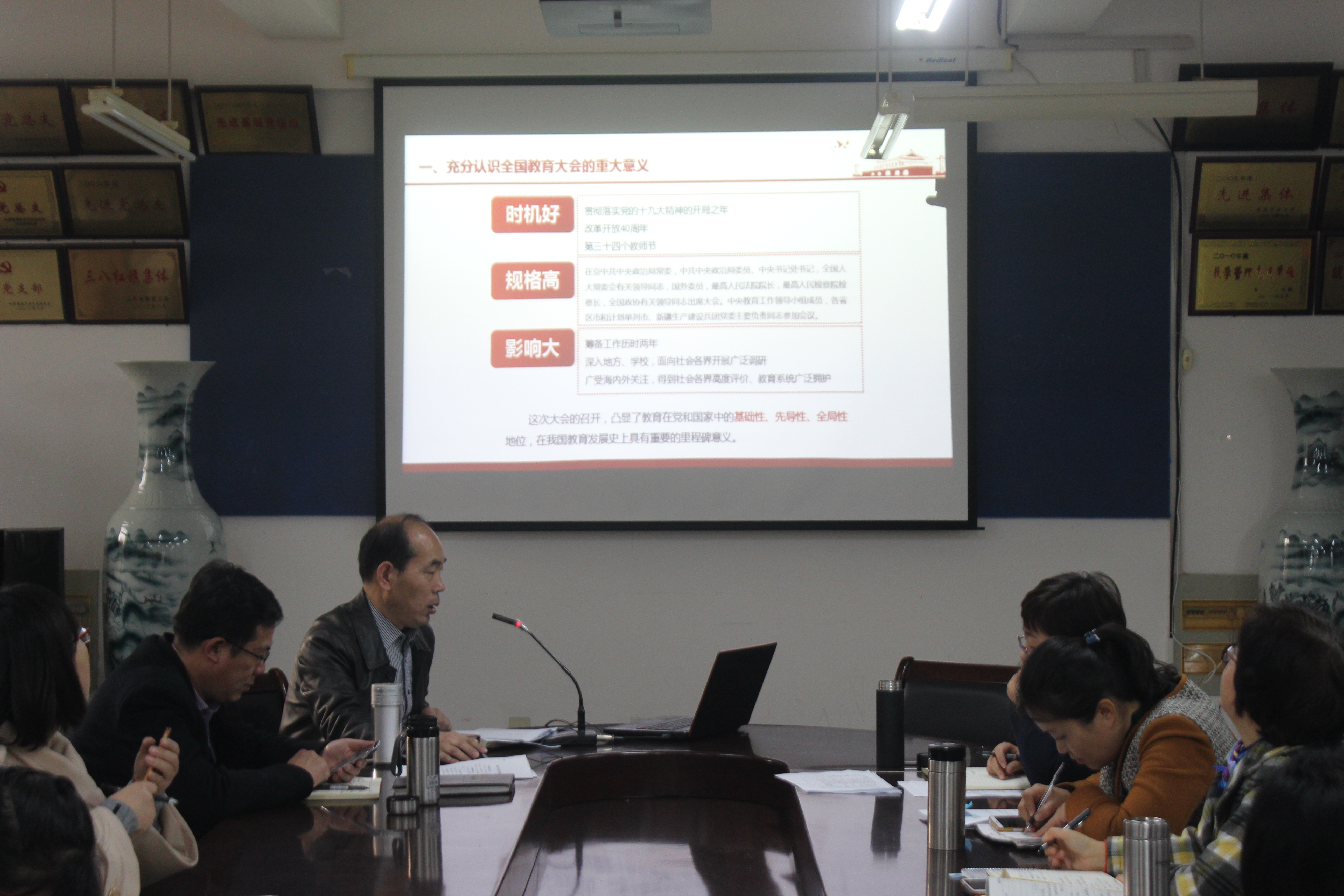 王仁高从四个方面宣讲了全国教育大会精神。一是要充分认识全国教育大会的重大意义。这次全国教育大会在中国特色社会主义进入新时代、以习近平同志为核心的党中央决定召开的第一次全国教育大会,时机好、规格高、影响大。大会在总结成绩的同时,直面当前教育改革发展中存在的问题,为新时代教育改革发展指明了方向,对加快推进教育现代化、建设教育强国、办好人民满意的教育进行了全面系统部署。二是要深入学习领会习近平总书记关于教育的重要论述。要结合工作实践,深入理解和把握“九个坚持”(即:坚持党对教育事业的全面领导的根本要求,坚持立德树人的根本任务,坚持优先发展教育事业的战略部署,坚持社会主义办学方向的政治原则,坚持扎根中国大地办教育的自觉自信,坚持以人民为中心发展教育的价值追求,坚持深化教育改革创新的鲜明导向,坚持服务中华民族伟大复兴的重要使命,坚持把加强教师队伍建设作为基础工作的重大意义),准确把握新时代好老师的内涵要义,做让党放心、让人民满意的教育工作者。三是要扎实推进加快教育现代化的重点任务。要落实教育优先发展战略,实施新时代立德树人工程,加强新时代教师队伍建设,回应人民群众教育关切,深化教育领域综合改革,提升教育服务经济社会发展能力,加强教育系统党的领导和党的建设。四是要全力确保教育大会精神落实落地。要提高政治站位,明确“新、高、实、深”要求(即贯彻落实工作要“新”,学习宣传贯彻水平要“高”,落实践行要“实”,学理阐释要“深”),把握“四转”工作方法(即转时态、转语态、转状态、转心态),开展好“五个行动”(即传达行动、宣讲行动、培训行动、研讨行动、调研行动),建立“五个清单”(即问题清单、课题清单、政策清单、任务清单、责任清单)。