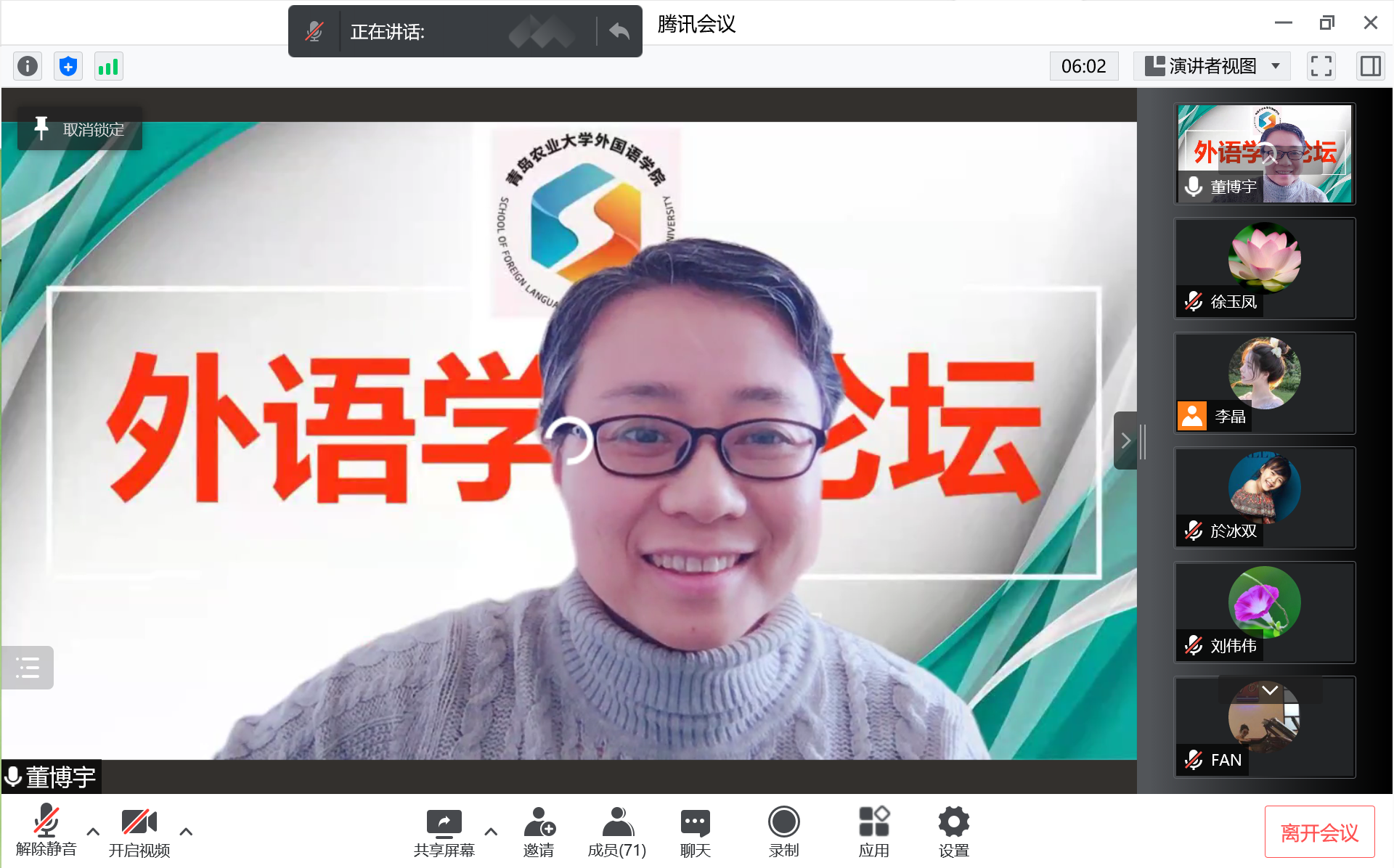 3月31日,William威廉英国通过腾讯会议召开线上外语学术论坛第十七讲。此次学术论坛由英语专业二室董博宇博士主讲,题目为《谴责合理化依据的会话分析研究》,学院全体领导、教职工与会,副院长高秀雪教授主持论坛。